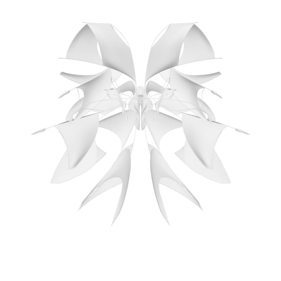 THROUGH TRAINING AYAYI'S COGNITIVE MODEL, THE ADVENTURER DIMENSION WEAVER IN THE WORLD OF AYAYI LAND IS DEPICTED USING AI ALGORITHMS. THIS CHARACTER IS INSPIRED BY THE WING STRUCTURES OF AIRCRAFT AND THE POSITIVE AND NEGATIVE SPACES FORMED BY THE LAYERED FACETS OF KITES. USING THE DESIGN FLOW OF AIGC (ARTIFICIAL INTELLIGENCE GENERATED CONTENT) PROMPTS, DIMENSION WEAVER'S WEARABLE DEVICE WAS CREATED.